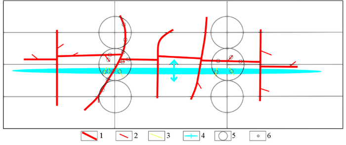 1—major fault;2—secondary fault; 3—joints and fissures; 4—anticlinal axis; 5—node location and its acquisition point range; 6—sampling point