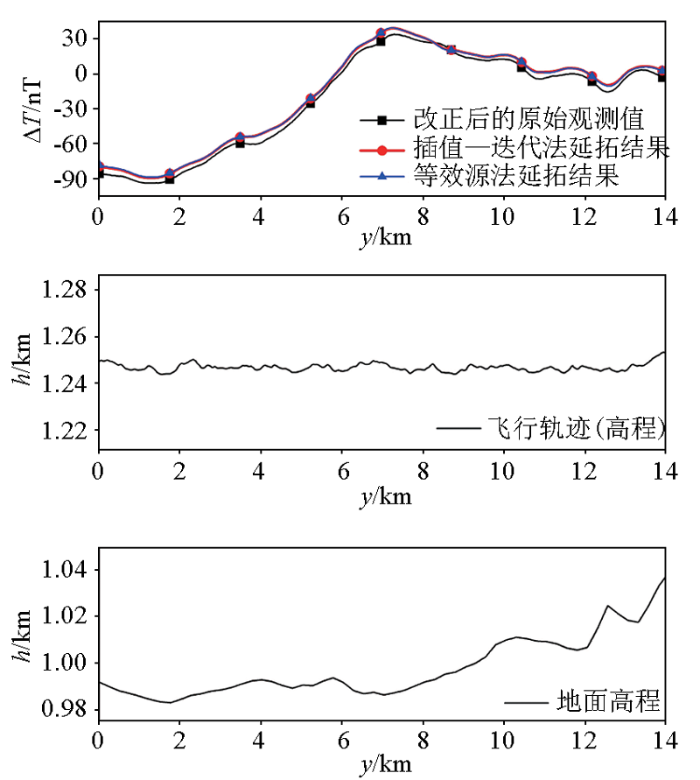 采用插值—迭代法和等效源法对地面磁异常进行向上延拓,构建航线上的磁力参考值,从而实现航磁测量系统的外符合精度评估。插值—迭代法的计算步骤为:①根据飞行测线的切割面构建空间三维格网(切割面个数为8,相邻面高差为10 m);②将地面磁异常向上延拓到航空切割面(位于地面下方的水平面高度取0.9 km);③利用三元Lagrange插值法逐点计算飞行测线上的磁异常(插值多项式阶数取3)。利用等效源法向上延拓时,采用的磁倾角为50°、磁偏角为5°(利用IGRF-13计算得到)。三层等效源模型均水平分布,第一层等效源与地面观测点在垂直方向上一一对应,共2 610(58×45)个格网点,格网分辨率为250 m×250 m,埋深750 m(相对于地形平均高度面,下同);第二层等效源分布区域中心与实验区中心重合,共208(16×13)个格网点,格网分辨率为1 km×1 km,埋深为2.25 km;第三层等效源分布区域中心位置同样为实验区中心,共30(6×5)个格网点,格网分辨率为4 km×4 km,埋深为9 km。