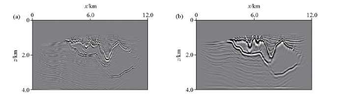 QRTM (a)和无补偿RTM (b)进行拉普拉斯滤波后的Sigsbee2B模型图像