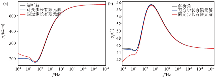本文所使用的有限元正演程序由python编写。图4 为地电模型参数ρh =[200,800,500]的解析解与有限元正演对比曲线,曲线结果验证了编写的有限元正演程序是正确的;正演网格深度要求2 600 m,固定步长有限元网格厚度10 m,则需要网格数260层,可变步长有限元首层厚度1 m,网格厚度递增参数1.05,网格数只需要100层即可到达要求的正演深度,可见可变步长有限元正演在提高正演效率的同时,精度也更高。
