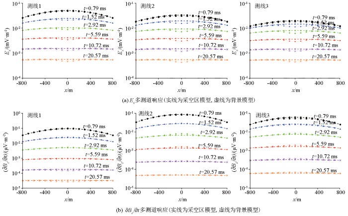 从图8a中可以看出,3条测线上电场x分量的响应基本相似,电场Ex多测道曲线在异常体对应位置幅值较低,3条测线的Ex响应均能够反映异常体的横向变化。从图8b中可以看出:测线1在早期时刻,异常体位置的响应幅值高于背景值,但是在晚期时刻,异常体位置的响应幅值明显低于背景值;测线2在早期时刻,异常体位置的响应幅值低于背景值,随着时间的推移,异常体位置的响应幅值又逐渐高于背景值,最终,采空区模型的响应与背景模型的响应曲线基本重合;测线3在早期时刻,异常体位置的响应幅值低于背景值,但是在晚期时刻,异常体位置的响应幅值又明显高于背景值,因此,3条测线上观测的∂Bz/∂t响应有较大差异。以上分析为实际探测资料的解释提供了理论依据。