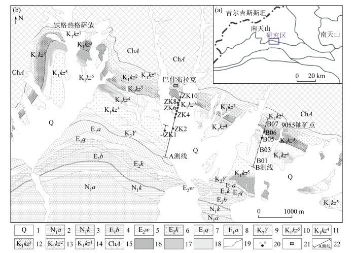 1—第四系;2—安居安组;3—克孜洛依组;4—巴什布拉克组;5—乌拉根组;6—卡拉塔尔组;7—齐姆根组;8—阿尔塔什组;9—英吉沙群;10—克孜勒苏群第一岩性段;11—克孜勒苏群第二岩性段;12—克孜勒苏群第三岩性段;13—克孜勒苏群第四岩性段;14—克孜勒苏群第五岩性段;15—长城系阿克苏群;16—氧化带Ⅰ;17—氧化带Ⅱ;18—氧化带Ⅲ;19—地层界线;20—工业矿孔、矿化孔、无矿孔;21—铀矿床/点;22—地气试验测线
