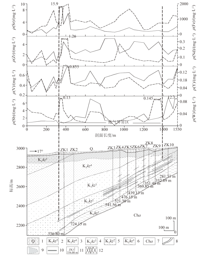 1—第四系;2—下白垩统克孜勒苏群第五岩性段;3—下白垩统克孜勒苏群第四岩性段;4—下白垩统克孜勒苏群第三岩性段;5 —下白垩统克孜勒苏群第二岩性段;6—下白垩统克孜勒苏群第一岩性段;7—中元古界阿克苏群;8—整合界线、角度不整合界线;9—氧化带;10—工业矿体、矿化体、异常体;11—钻孔编号、深度;12—地气测量曲线