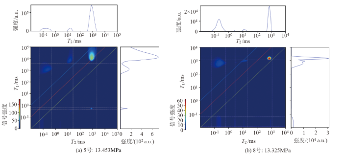 图3为研究区5号和8号煤的二维核磁实验结果。图中显示:5号煤,吸附气的T2值为0.05~0.45 ms、T1值为490~3 700 ms,游离气的T2值为8.5~26 ms、T1值为3 800~10 000 ms;8号煤,吸附气的T2值为0.065~0.62 ms、T1值为280~1 100 ms, 游离气的T2值为8~20 ms、T1值为600~1 100 ms。