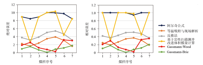 图5显示阿尔奇公式计算结果与二维核磁结果相差较大。可能阿尔奇公式不适用于深煤层,推测可能是由于裂缝孔隙的影响造成计算结果误差较大,基于数字岩心技术进行实际岩心的模拟仿真或将厘清其影响机制。基于岩性扫描测井改进体积模量计算方法在某些时候计算结果较为准确,比如2号和6号煤样,而其他煤样误差较大,推测可能是由于岩性变化较大所致。对于其他方法,由反推法、Gassmann-Wood和Gassmann-Brie方程计算所得游离气饱和度较稳定,相对误差在0.5以下,推测是由于游离气含量极少、溶解气含量不可忽略以及常规取心过程中气体的损失等因素所致。综合对比显示,Gassmann-Brie方法计算所得游离气饱和度与二维核磁计算所得结果最接近。