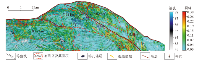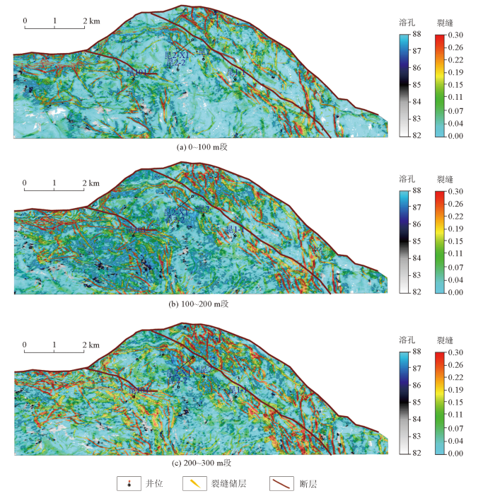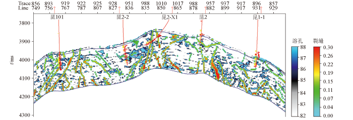 将预测溶孔储层的融合概率属性与预测裂缝的最大似然属性进行叠合,开展孔—缝储层叠合分析。图8为昆101、昆2-2、昆2-X1、昆2、昆1-1井联井孔—缝叠合剖面,图中显示:纵向上储层非均质性强,大尺度裂缝以高角度缝为主,沟通不同深度溶孔储集空间;裂缝集中发育区溶孔发育程度高,与地质规律一致,溶孔储层发育受裂缝控制。