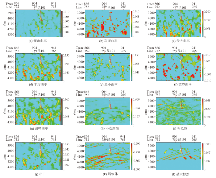 昆2区块均发育逆断层,研究区整体断裂较少,考虑到研究精度的需要,本次利用常用的预测裂缝敏感的曲率、相干、不连续性、蚂蚁体和最大似然等5大类12种属性分别开展裂缝预测,对12种裂缝预测属性开展过井效果对比分析。