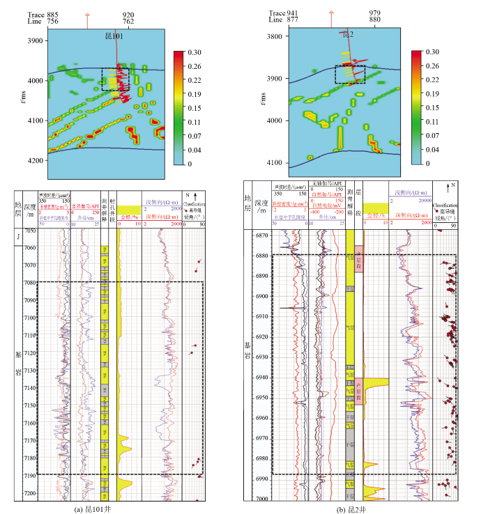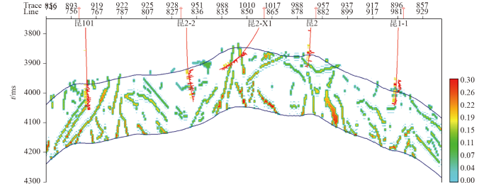 图6为过昆101、昆2-2、昆2-X1、昆2、昆1-1井联井裂缝预测剖面,纵向上不同深度段、不同尺度裂缝均有发育,以高角度缝为主;横向上井间裂缝分布差异大,昆101、昆2-X1及昆2井附近裂缝较发育,昆2-2、昆1-1裂缝局部发育。