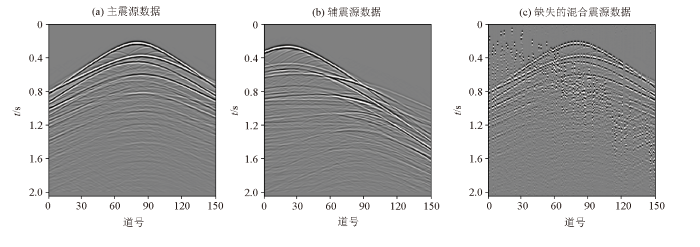 理论数据由两个单震源数据合成,如图2a 和2b 所示。两个单震源数据均为150道,每道512个时间采样点,采样间隔为4 ms。首先对主震源和辅震源都进行30%的随机道集缺失,再对辅震源在 [-150 150] ms进行随机时间延迟,进行混合后得到的数据如图2c 所示。可以看出,主震源和辅震源由于道集缺失不具有连续性,辅震源随机时间延迟后分布散乱,表现为随机噪声。处理的目的就是从混合数据中分离并重建出完整的主震源数据。