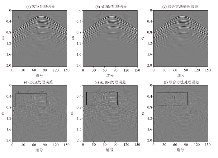 为了检验联合方法在实际中的应用效果,将实测数据进行缺失和混合处理,模拟野外多震源采集过程。实测数据有180道,采样时长为2 s,采样间隔4 ms,且都进行30%的随机道集缺失,辅震源在[-200 200] ms进行随机时间延迟,得到的混合数据如图7a 和7b 所示。用3种方法分别对其进行同时分离和重建,迭代次数选择10次,其他参数设置一致。处理后的结果如图8a~c 所示,ISTA、ALBM和联合方法的信噪比分别是7.32、6.74和8.23 dB。说明实际数据处理中,联合方法相对ISTA和ALBM具有更高的精度。图8d~f 是3种方法处理后的误差。ISTA和ALBM在右侧存在较多的混合误差,对有效信号的损伤更大(黑框处)。联合方法能更好地去除混叠噪声,保留更多的有效信号。因此,在实测数据的同时分离和重建中,联合方法的处理效果仍然优于传统单一方法。