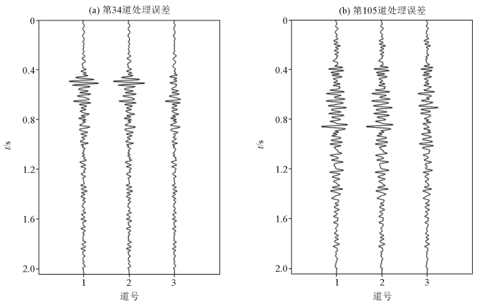 为了能在细节上对比这3种方法同时分离和重建的效果,随机选取了两个单道地震记录在分离和重建前后的误差。图4a 和图4b 分别为第34道和第105道分离和重建的误差曲线,图中的1~3道分别是ISTA、ALBM和联合算法的处理误差。曲线幅值越大代表得到的结果与原始主震源数据的误差越大。可以看出,联合方法的误差最小,说明对有效信号的损失也较小。综上,联合方法在多震源数据同时分离和重建处理中信噪比更高,能更高精度得到完整的主震源数据。