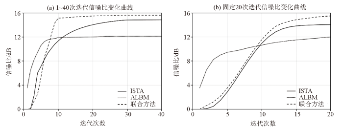 此外,为了进一步了解3种方法在不同迭代次数下的处理效果,将最大迭代次数从1逐渐增加到40,绘制出信噪比随迭代次数变化的曲线图,如图5a 所示。联合方法有更快的迭代速度,经11次迭代达到收敛,且精度更高。图5b 为最大迭代次数20时,信噪比随迭代次数的变化曲线图。可以看出,ALBM由于直接引入了未阈值的数据,在前期保留了较多的有效信号,有相对较高的信噪比和上升速率,但随迭代次数增加,上升速率降低,并且收敛后的信噪比较低。ISTA和联合方法前期有较快的上升速率,但随着迭代次数增加,ISTA的上升速率逐渐缓慢,需要更多的迭代次数才能达到收敛;而联合方法仍能保持较快的上升速率,达到收敛时有更高的信噪比。