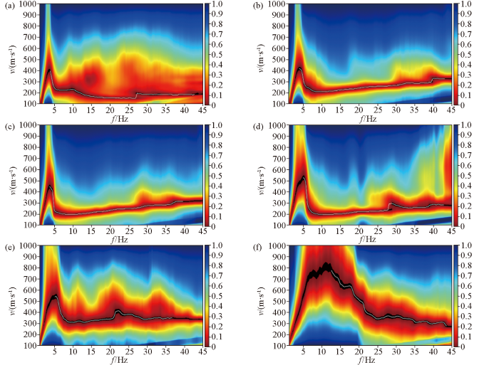 a、c、e—分别为L1、L2、L3测线在15 m处频散谱;b、d、f—分别为L1、L2、L3测线在30 m处频散谱