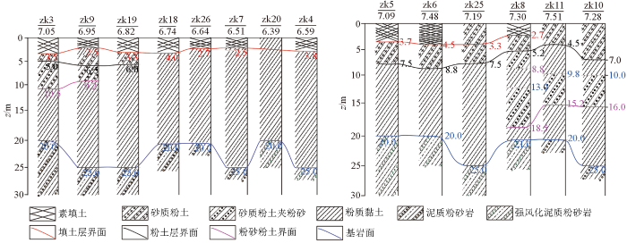 对提取的频散曲线应用式(6)~(8)中的经验关系,将所有频散数据反演为横波速度后挑选异常明显的横波速度剖面,如图11、12。从图11(L5~L8测线)中可以看出,地层速度总体呈现从浅部向深部递增的趋势,速度分布范围在150~800 m/s。结合zk3资料,如图13所示,地层深度3.5 m以上为第四系素填土,速度较低,地表起伏小,横波速度小于150 m/s,深度范围5~10.5 m处分布砂质粉土夹粉砂层,呈现低速特征,横波速度小于270 m/s符合实际地层地质结构。在L5~L8测线(图11)中,剖面中浅部低速特征疑似受路面混凝土结构影响,呈现低速带特征,较为吻合钻孔资料。L5、L6测线剖面在25 m深度附近地层界面清晰,速度等值线呈东高西低的特征,推断该深度为上覆沉积层与下覆基岩(泥质粉砂岩)的分界线(图中粉色线)。在L5~L8测线剖面中部深度(约5~10 m)存在低速带,根据L6测线验证钻孔位置,未发现低速带的构造与轨道发生联通现象且未发现明显渗水漏水异常。