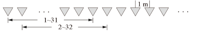 2024年4月,南京某区域针对城市地下空间展开被动源面波成像研究,此探测主要为了查明地铁5号线穿越机场路段地质结构以及该段5号线渗水漏水原因。观测系统采用线型布设,使用smartsolo节点式短周期地震仪,采样率设置为1 ms,一次性布置60或75个台阵,道间距为1 m,观测时长为60 min。根据探测深度要求,在计算频散时,观测排列道数采用31道,排列长度为30 m,依次提取1~31道、2~32道等作为一个探测排列,并把排列中心作为面波探测测深点位置,如图8所示。