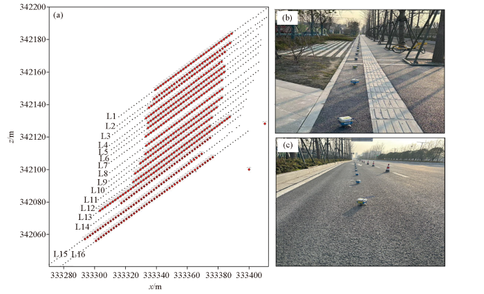 根据实际工程要求及观测系统设计,图9为此次密集台阵被动源地震成像实际布设测线位置以及现场施工图,其中黑点为台阵布设位置,红色框表示面波测深点。此次探测共完成16条被动源地震测线数据采集,编号为L1~L16。