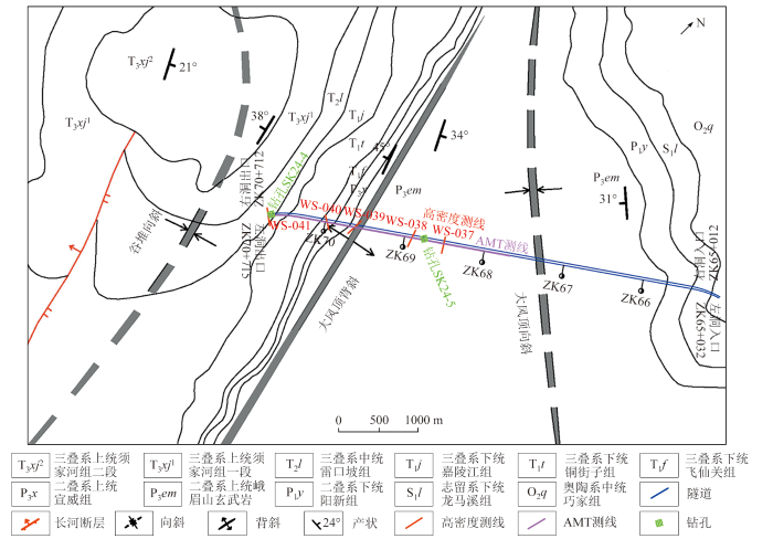 大风顶隧道为分离式隧道,左线起止桩号为 ZK65+032~ZK70+715,全长5 683 m,右线起止桩号桩号为(ZK65+012)~(ZK70+712),全长5 700 m;最大埋深达到1 006 m,是一条典型的深埋特长隧道,区域地形地貌、地层岩性、地质构造和水文地质条件复杂。因此,在区域地质分析和初步地质调绘的基础上,明确主体构造形式,并进一步通过轴线物探、构造分析,以构建隧址区的构造格架。