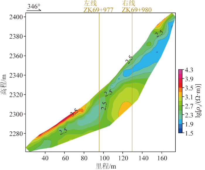 High-density apparent resistivity profile at ZK69+977 (WS-040) for the left line of the Dafengding tunnel