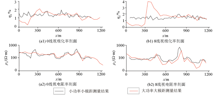 云南某矿区0线(a)和8线(b)激电中梯扫面大功率大极距与小功率小极距测量结果对比