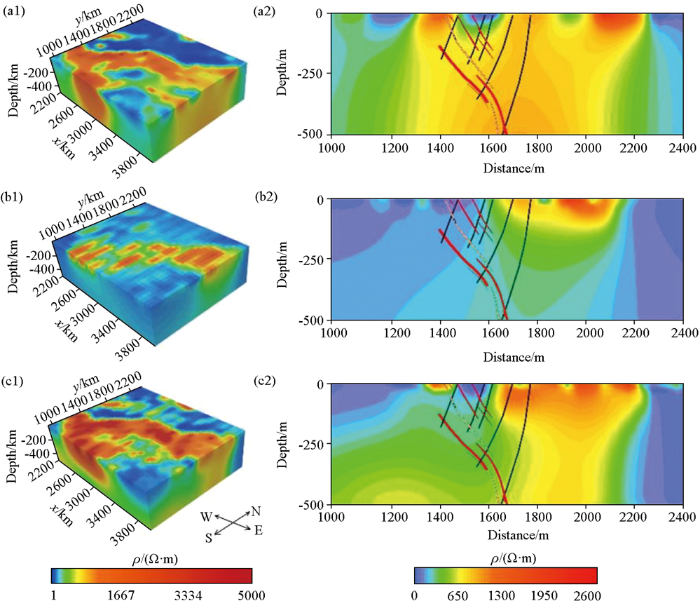 a1—使用SN向发射、SN向接收的三维数据(伪三维);b1—EW使用EW向发射、EW向接收的三维数据(伪三维);c1—SN向和EW向分别发射、观测点矢量接收的三维数据(真三维);a2、b2和c2分别是从a1、b1 和c1三维结果中截取的剖面