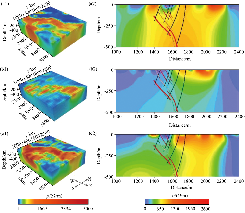 图3 伪三维与真三维电阻率成像结果对比[ a1—使用SN向发射、SN向接收的三维数据(伪三维);b1—EW使用EW向发射、EW向接收的三维数据(伪三维);c1—SN向和EW向分别发射、观测点矢量接收的三维数据(真三维);a2、b2和c2分别是从a1、b1 和c1三维结果中截取的剖面 |