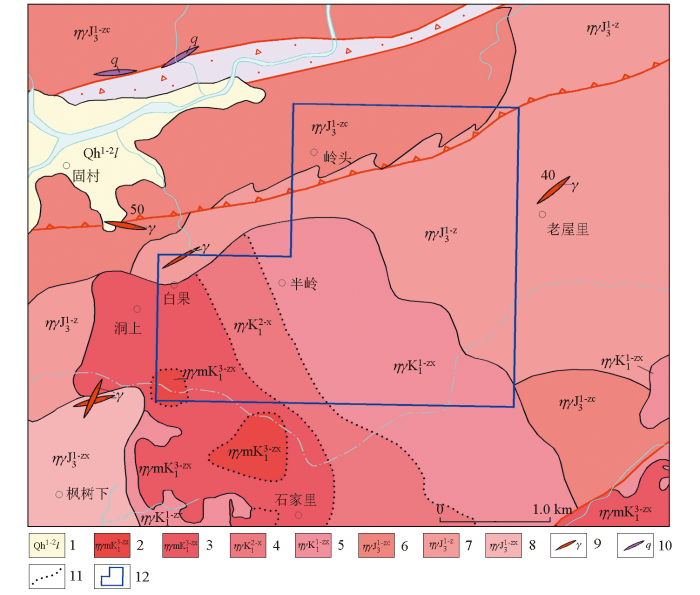 1—Holocene Series Lianwei Formation;2—strong albitization medium-fine grain muscovite-granite in early Cretaceous;3—weak-medium albitization medium-fine grain muscovite monzonitic granite in early Cretaceous;4—fine grain muscovite monzonitic granite in early Cretaceous;5—medium-fine grain biotite-muscovite monzonitic granite with speckled crystals in early Cretaceous;6—medium-coarse grain porphyritic biotite-muscovite monzonitic granite in late Jurassic;7—medium grain porphyritic biotite-muscovite monzonitic granite in late Jurassic;8—medium-fine grain porphyritic biotite-muscovite monzonitic granite in late Jurassic;9—granite vein;10—quartz vein;11—lithofacies boundary;12—scope of the census area