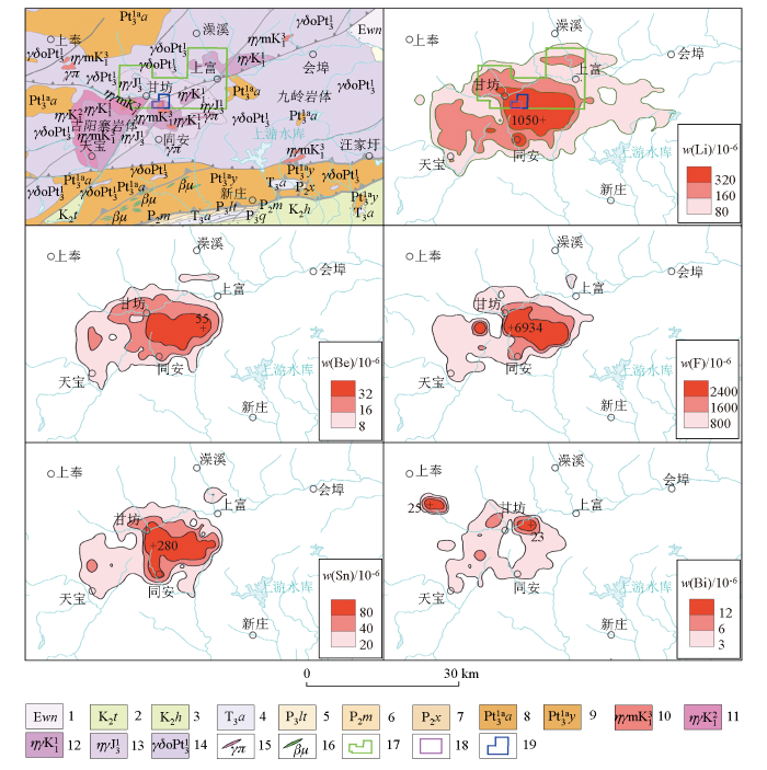 全省区域化探圈出以Li为主的综合异常60余处(Li异常下限80×10-6),其中,甘坊Li异常规模全省最大,是江西省最为醒目的异常。Li异常面积668 km2,平均含量224.7×10-6,最高含量1 050×10-6,总体呈近EW向椭圆分布,与甘坊复式岩体空间展布基本一致。同时,伴生F、Be、Sn、Nb、W、Bi、Cu、Pb、Zn等元素异常(图2),F异常面积320 km2,平均含量1 806×10-6,最高含量6 934×10-6;Be异常面积376 km2,平均含量20.7×10-6,最高含量55×10-6;Sn异常面积324 km2,平均含量55.3×10-6,最高含量280×10-6。