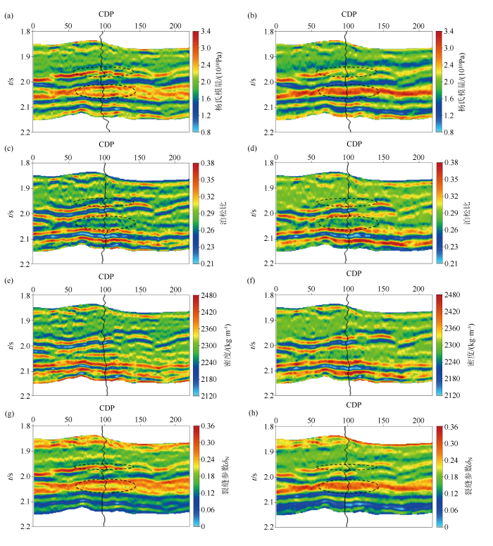 The nonlinear inversion results(left) and indirect fitting results from conventional linear inversion(right) elastic parameters of actual pre-stack seismic profiles