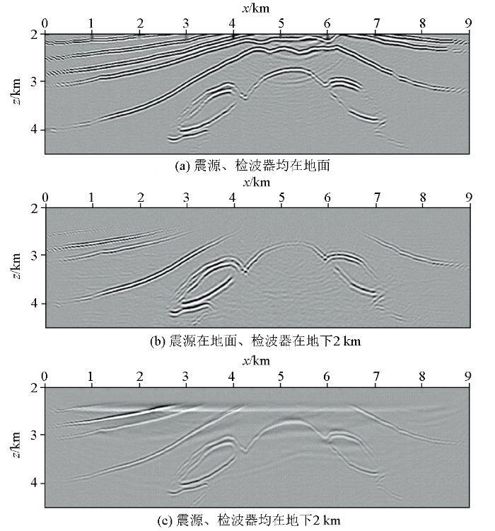 1)基于地震干涉法,能够利用地震资料的直达波和上行反射波来获得深度基准面的虚拟反射地震记录。该虚拟采集方式能够有效突出深层小尺度地质体引起的弱反射,获得更大反射角的信息,为深部小尺度构造成像奠定数据基础,实现对目标构造的高精度成像。