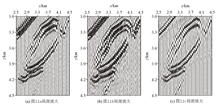 地震干涉法通过对不同类型地震资料进行处理,使重构的观测系统更靠近目标构造,能够得到更好的局部目标成像效果。对于井周陡倾角构造,可以通过地震干涉法提升其有效反射角来实现该构造的高精度成像。与常规RTM成像方法相比,地震干涉法可将基准面延拓到目的层,使得观测系统更靠近目标地质体,减少地层反射信息的散射,深层地震波能量得到加强,地震剖面的成像精度明显提高。高精度成像数据能够提升储层精细解释和油气识别的精度,为复杂隐蔽油气藏和页岩油气的勘探开发提供了数据基础[14-