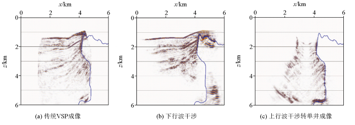 分别采用传统VSP成像法、下行波干涉成像法、上行波干涉转单井成像法对该模型进行成像,成像结果如图16所示。通过对比可得,传统VSP成像仅能够对井周构造进行成像,无法对检波器上方区域进行成像。