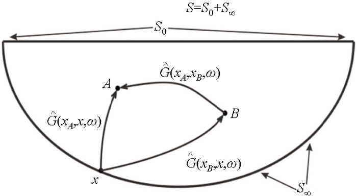 同理,将状态B的波场表达式与状态A的波场表达式合并,可得频率域格林函数: