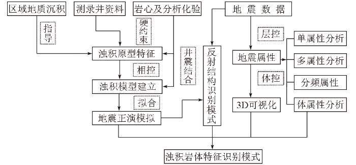 下刚果盆地深水区发育的水道浊积体具有其独特性,其物源为富砂的大型刚果扇,储层砂地比较高,储集条件优越,是深水区油气最重要的储集体。一般而言,发育于不同位置的水道,其形态和规模差别较大,依据水道的几何特征、充填样式、内幕结构,结合前人的研究和区域认识,通过野外观测、室内模拟,特别是基于高质量三维地震成像资料等识别和定义了水道(主轴)、溢岸沉积(天然堤)、朵叶体、垮塌和块体搬运沉积等多种重力流沉积单元,并建立了浊积体特征识别技术流程(图1)。该项工作对深化浊积体系认识和储层地震的定量化预测具有重要的指导作用。