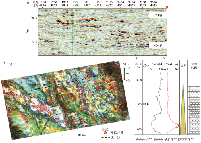 a—近东西向反射地震剖面;b—地震分频RGB融合属性;c—过井地层岩性剖面