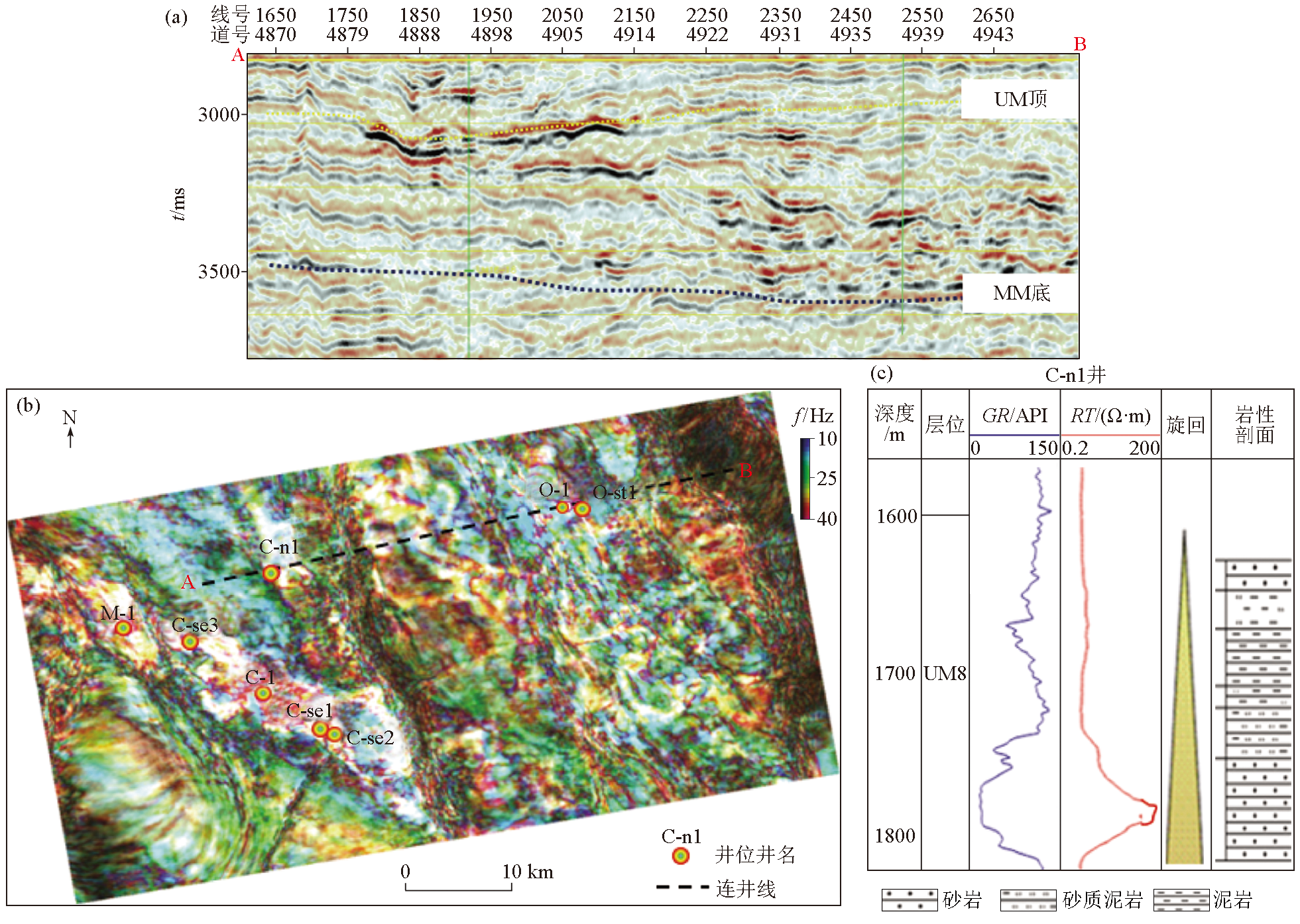 | 图3 地震分频体RGB融合属性图及C-n1井岩性剖面 a—近东西向反射地震剖面;b—地震分频RGB融合属性;c—过井地层岩性剖面 |