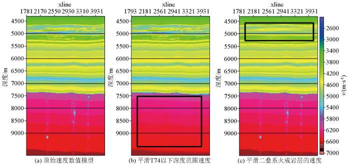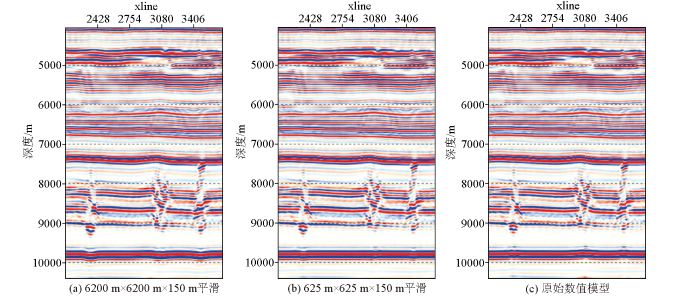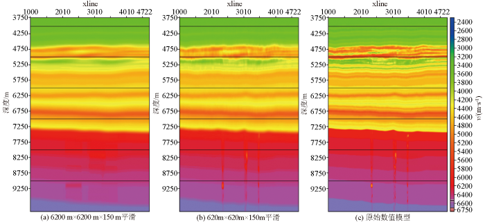 对数值速度模型进行不同尺度、不同层系的平滑分析。图2为对数值模型整体进行不同尺度的平滑结果,图3为图2不同速度对应的RTM成像剖面。通过对比,可以明显看出,大尺度平滑不会改变速度整体格架和低波数分量,也基本不改变沿着水平方向延伸的大套主干层系的成像深度和聚焦度以及分辨能力,但高波数分量的局部精细速度成分会被平滑掉;6 200 m大尺度平滑半径的速度,误差影响大于620 m平滑,但影响最大的地方也仅表现为在类似于9 000 m深度的断控储集体根部,对应成像深度统计存在平均约120 m(1.3%)的深度误差,而对断控储集体的成像聚焦程度和分辨能力影响很小。即,原始数值速度模型平滑的影响主要表现为各向异性发育区的断控储集体存在轻微的成像构造改变,而对全层系各地质体的成像聚焦精度影响甚微。
