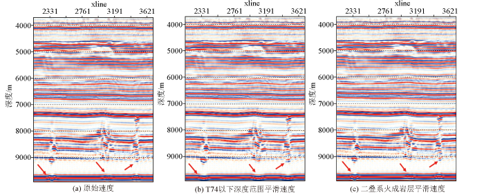 图5为图4不同速度模型对应的RTM成像剖面。通过满覆盖区的三维成像统计对比得知,图4b对奥陶系速度平滑后,对成像影响最大的地方,如图5b箭头所示是在9 000 m深度附近断控储集体根部,其深度误差主要集中在30~50 m(平均0.42%)。图4c对二叠系的速度平滑,对成像影响最大的地方,如图5c所示,是深度在5.5 km附近的二叠系火成岩下100 m内的地层扭动假象影响,扭动误差绝对值统计平均在20 m左右(5%);对之下的地层成像误差逐渐减弱,进而对深层断控储集体的影响,如图5c箭头对比所示,在9 000 m深度附近断控储集体根部的深度误差主要集中在10 m左右(0.1%)。同时可以发现,两类速度平滑对断控储集体的成像聚焦精度影响都比较小。