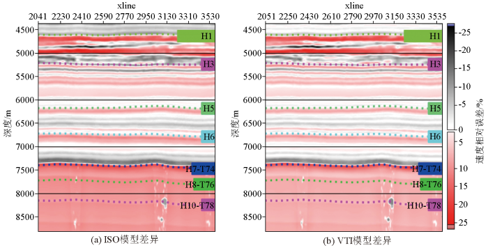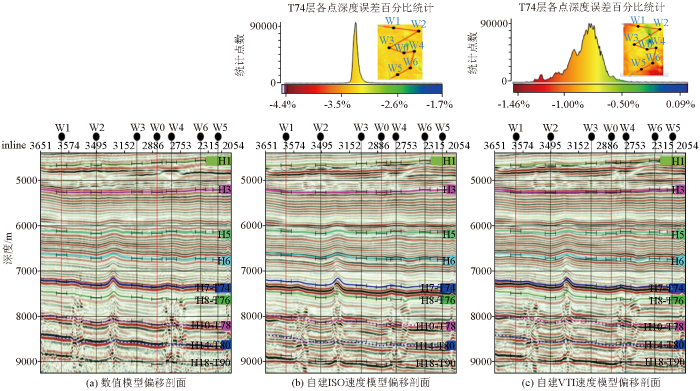 图9为不同速度模型对应偏移剖面和T74层VTI前后的深度误差统计,其中7口井所在平面图为沿着T74层的深度误差百分比统计显示图,7口井的位置较为均匀地分布在三维采集数据的满覆盖区域中。通过7口虚拟井数据的井震匹配与成像精度对比分析可以看出,VTI模型在井震深度匹配方面优于ISO。在做VTI计算时,所有层位中仅T74(H7层)未参与计算,将其作为验证层。图中层位均为原始数值模型偏移后的对应层位。从VTI前后的T74层沿层各点深度误差百分比对比中可以看到VTI对井震匹配所发挥的作用,具体而言,VTI之前的井震深度误差主要集中在1.5%~2%的范围内。而经过VTI处理后,误差范围缩小集中至0.5%~1%,误差缩小近一半左右。