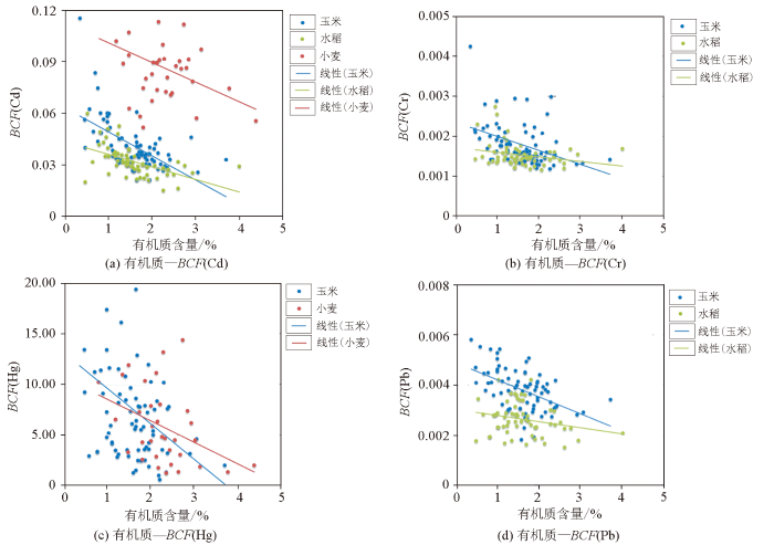 4)作物对重金属的吸收富集普遍受到土壤有机质的抑制,以玉米富集系数受土壤有机质的影响最为显著。