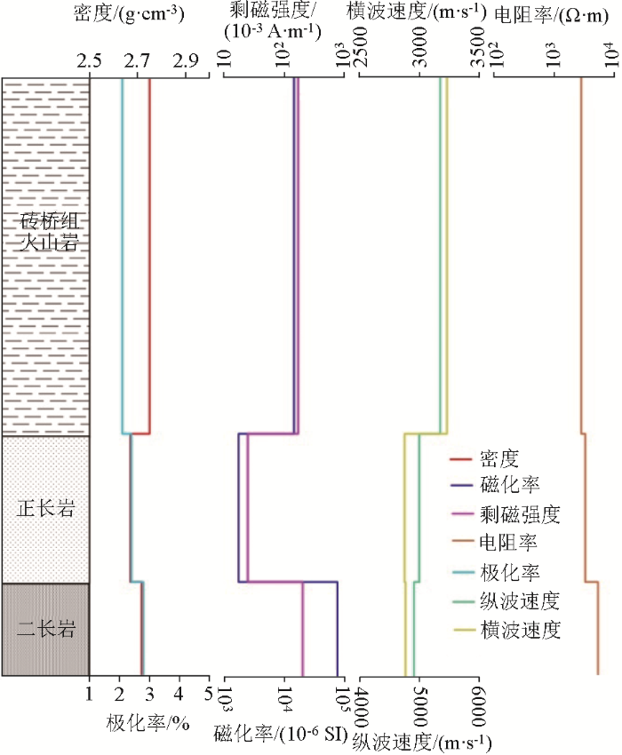 本文中除密度参数与地球物理测井资料结果接近外,其他物性参数存在较多不相符情况。其中,本文电阻率数据呈中—高阻特征,与测井数据(视电阻率,除粗安岩外)大致相同。在ZK01钻孔中,岩石自上而下发生了较强的蚀变,可能是导致测井时粗安岩具低阻特征的主要原因。另外,本文所测正长岩磁化率呈显著弱磁特征,测井岩石磁性均呈中—强磁特征,基本无差异。测井中粗安岩与正长岩纵波速度一样,略高于二长岩。岩心物性测定与地球物理测井数据之所以产生差异,原因在于测井数据通常是由多方面因素构成的,在地球物理测井过程中,常受到井液、旁侧井壁及测量装置等多种因素影响。而岩石物性工作更侧重于对样品的详细分析,且规格化样品测定时环境稳定,反映的是该样品真实、高精度的物性参数数据。