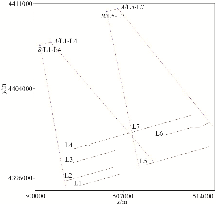 广域电磁法的视电阻率首支曲线(也就是高频部分),由于趋肤深度很浅,其视电阻率能相对比较准确地反映该地层实际的电阻率特征。结合本次完成的数据采集工作量将L4线与L7线数据整合成一条长剖面,用于首支统计工作[17]。