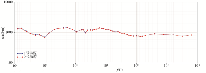 首先通过多项实验对工作参数及仪器一致性进行测量分析,确定测量电极距MN为50 m,收发距10 km,供电AB距为1 km,调节AB两极接地电阻使供电电流达到100 A,测量频率范围为0.01~8 192 Hz。通过计算仪器一致性得到相对均方误差为0.9%(图2),符合工作要求。