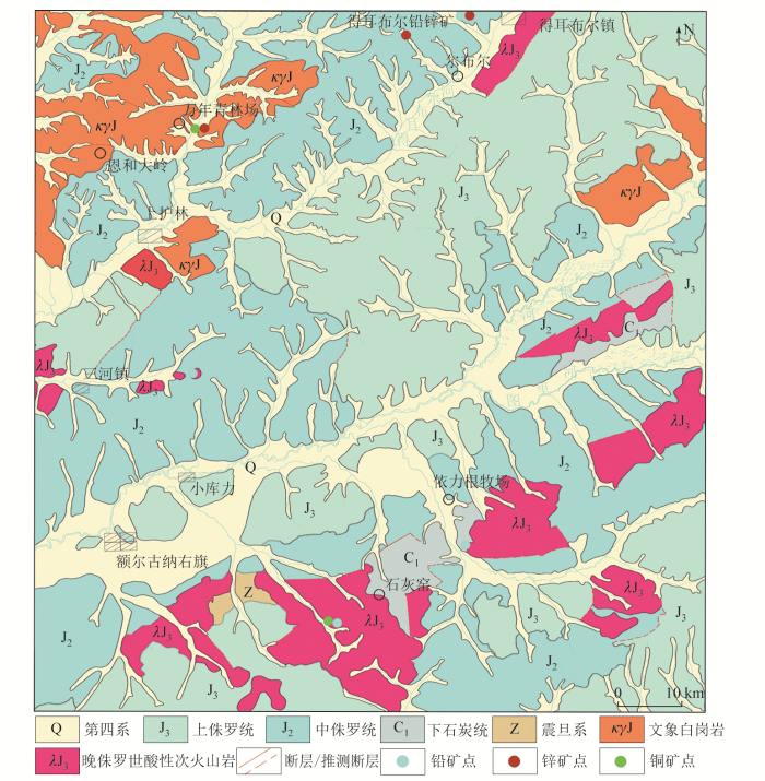 研究区侏罗系火山沉积地层分布最为广泛,为一套酸性—中性—基性火山岩、火山碎屑岩,主要岩性为安山岩、凝灰岩、玄武岩、流纹岩、流纹质火山碎屑岩、凝灰质砂砾岩等;局部分布下石炭系统、震旦系地层,石炭系下统岩性主要为细砂岩、斑点板岩、硅质岩、大理岩等,震旦系地层岩性主要为长石变粒岩、千枚状板岩、结晶灰岩等(图2)。研究区侵入岩岩性以侏罗系文象白岗岩为主,主要分布在研究区北西侧。研究区次火山岩岩性以晚侏罗世凝灰岩、英安岩、流纹质英安岩为主,主要分布于研究区南东侧。