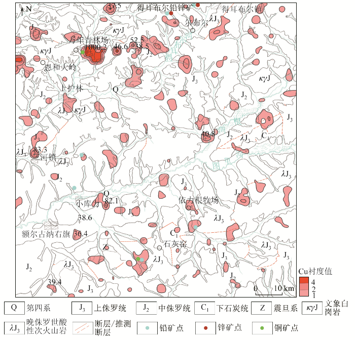 3)本区侏罗系塔木兰沟组是重点的赋矿层位之一,容矿岩石为安山岩、凝灰岩等,控矿构造为异常区内发育的断裂或大断裂旁次级断裂,具有强烈的铅锌矿化、褐铁矿化、黄铁矿化、硅化等,是本区重要的找矿标志,主要找矿方向之一为浅成热液裂隙充填交代型Pb、Zn、Ag多金属矿床。