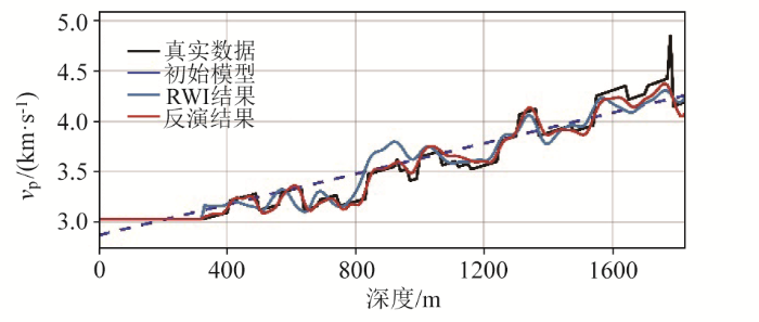 图8a 为线性初始模型,其整体速度略高于真实速度。图8b 是缺失4 Hz以下低频信息情况下,在时频域下采用反射波形反演与全波形反演联合反演的结果。可以看出当地震资料缺失低频数据时,即使采用了时频域多尺度的反演策略,波形反演也会陷入局部极值。图8c 是时频域反射波包络反演结果,经过时频域反射波包络反演可以较好地恢复背景速度,反演趋势与真实模型速度趋势相吻合。图8d 是经过反射波包络反演恢复低频信息后进行全波形反演的结果,对比图8b 和图8d 反演结果,可以看出经过反射波包络弥补低频信息缺失后,反演结果构造更加精细。分别抽取其在1 750 m处速度单道进行对比如图9 所示,经过反射波包络弥补地震数据中的低频缺失后,反演结果明显更贴近于真实速度曲线,中深部明显吻合更好,有效地缓解了波形反演易陷入局部极值的问题。增加了时频域多尺度联合反演的适用性,减少了低频地震数据的依赖性,更加适用于低频资料缺失的反演。