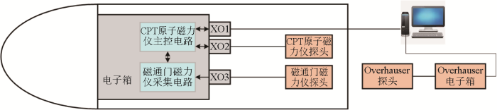 基于CPT原子磁力仪的拖曳式磁异常探测系统试验框架如图4所示。内部结构包括一个电子箱和两个磁力仪探头,整体精密布置以优化性能。磁通门磁力仪探头在y轴方向与CPT原子磁力仪探头光轴方向保持平行,可通过磁通门磁力仪输出数据得到CPT原子磁力仪探头光轴与磁场方向夹角信息。磁通门磁力仪通过XO3接口采集三轴磁场数据,并将这些数据传输到CPT原子磁力仪的主控电路。该主控电路通过XO2接口控制CPT原子磁力仪探头的信号和磁场数据采集。数据总包最终通过XO1接口输出至计算机进行处理和分析。图中Overhauser磁力仪电子箱和探头放置在吊舱外部,用于监测地磁场的长期变化,通过将CPT原子磁力仪的数据和Overhauser磁力仪的数据作差,可以获得不受地磁变化而影响的磁测数据。