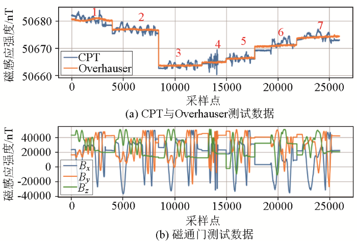 在地磁场环境下,所用CPT原子磁力仪的灵敏度达到8 pT/Hz1/2,非线性度为1.3 ppm,并具备自主全向适应能力。此外,磁通门磁力仪探头采用了Bartington公司的Mag690-FL100型号,正交误差小于0.5°。Overhauser磁力仪是加拿大GEM公司生产的GSM-19型号,该设备具有±0.1 nT的绝对精度,确保了地磁场测量数据的高准确度。