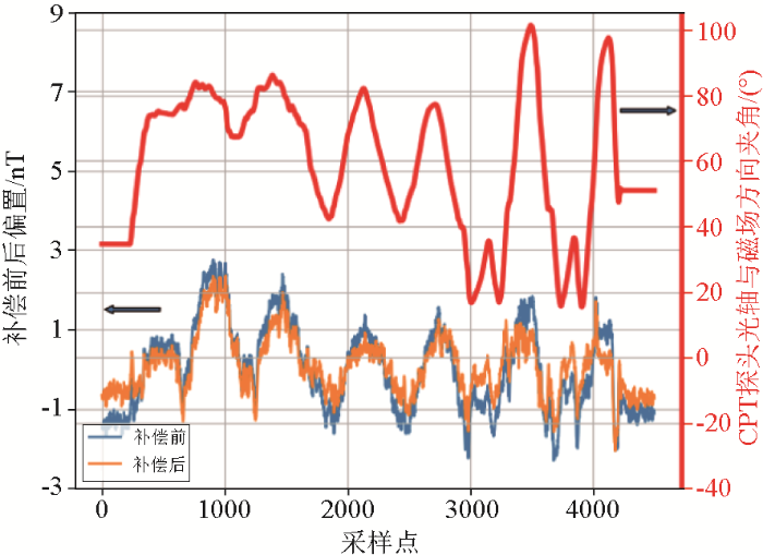 以数据集2为例,CPT原子磁力仪的转向差补偿结果如图8所示。横轴表示采样数据点,左边纵轴表示CPT原子磁力仪转向差补偿前后的偏置项,已减去Overhauser磁力仪参考值。可以看出转向差补偿后偏置项峰峰值变小,降低了由传感器方向变化引起的测量误差。右边纵轴表示不同采样数据点对应的CPT原子磁力仪探头光轴与地磁场方向之间的夹角,主要为转向差补偿提供依据。