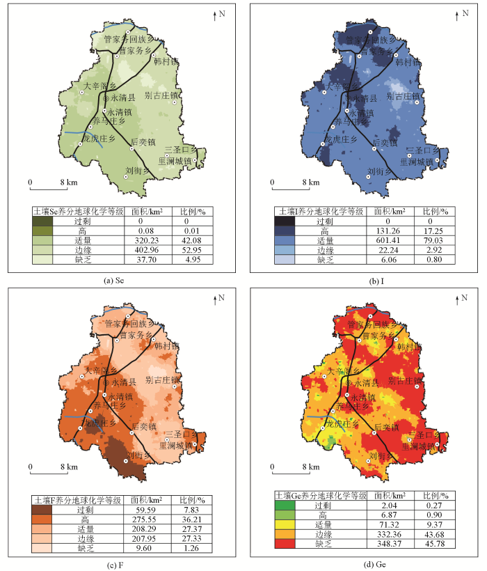 元素硒(Se)、碘(I)、氟(F)、锗(Ge)与人类的生命健康密切相关。永清县表层土壤中Se、I、F和Ge平均含量依次为0.17×10-6、3.84×10-6、557×10-6、1.21×10-6。如表4所示,永清县表层土壤中Se平均含量明显低于全国表层土壤平均值;I平均含量与全国表层土壤平均值接近,显著高于河北省平均值,约是河北省平均值的2.5倍; F平均含量明显高于全国和河北表层土壤平均值;Ge平均含量明显低于全国和河北表层土壤平均值[21]。从元素含量异系数角度来看,I的变异系数最大(63.5%),为高度变异;Se(28.2%)和F(20.1%)的变异系数中等,为中度变异;Ge的变异系数最小(11.9%),为低度变异。