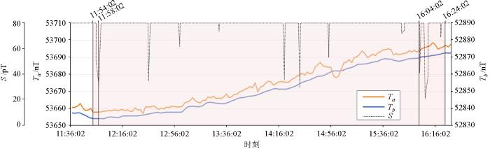 王旺庄磁异常背景日变站(Tb)和异常日变站(Ta)磁日变曲线及总噪声(S)